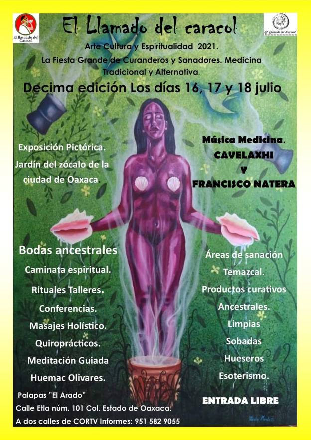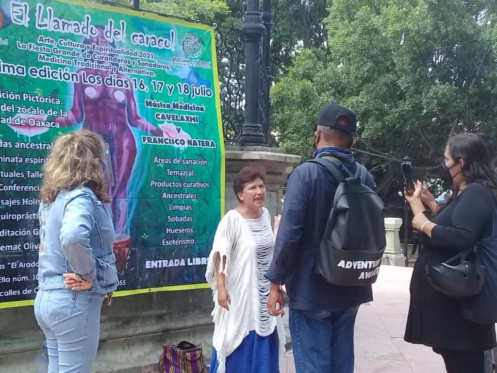 Oaxaca, Oax. 14 de julio.- Este viernes 16 de julio inician las actividades del X Encuentro de Curanderos Tradicionales “El llamado el Caracol”, que en esta ocasión, debido a la pandemia, se realizará en el espacio La Palapa El Arado, así lo dio a conocer su fundadora, Rocío Morales, ante medios de comunicación en el zócalo de esta ciudad, corazón de la capital oaxaqueña.