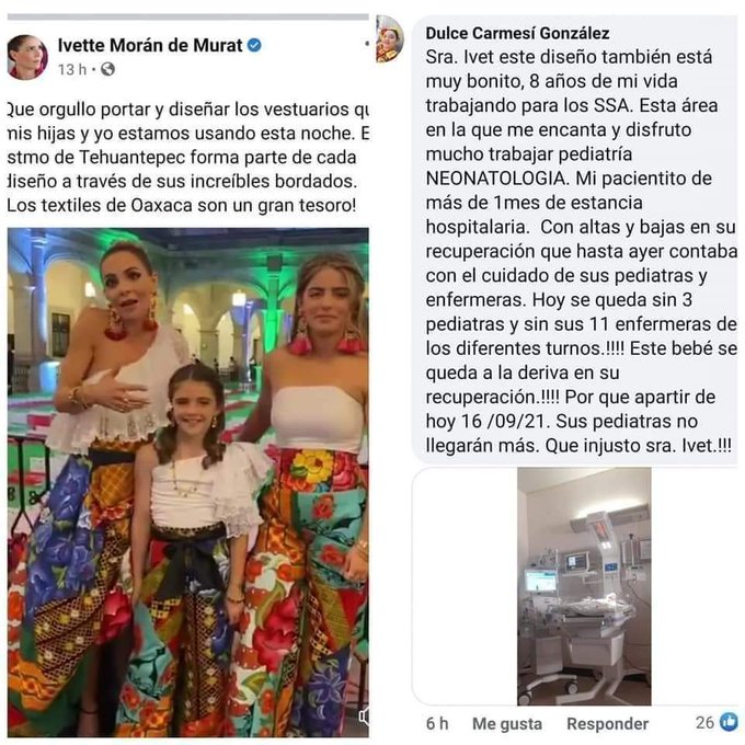 “Sra. Ivette este diseño también está muy bonito, 8 años de mi vida trabajando para los SSA. Esta área en la que me encanta y disfruto trabajar mucho, pediatría NEONATOLOGÍA. Mi pacientito de más de 1 mes de estancia hospitalaria con altas y bajas en su recuperación que hasta ayer contaba con el cuidado de sus pediatras y enfermeras, hoy se queda sin 3 pediatras y sin sus 11 enfermeras de los diferentes turnos ¡¡¡Este bebé se queda a la deriva en su recuperación!!!! Por que a partir de hoy 16/09/21. Sus pediatras no llegarán más. Que injusto sra. Ivette!!!”