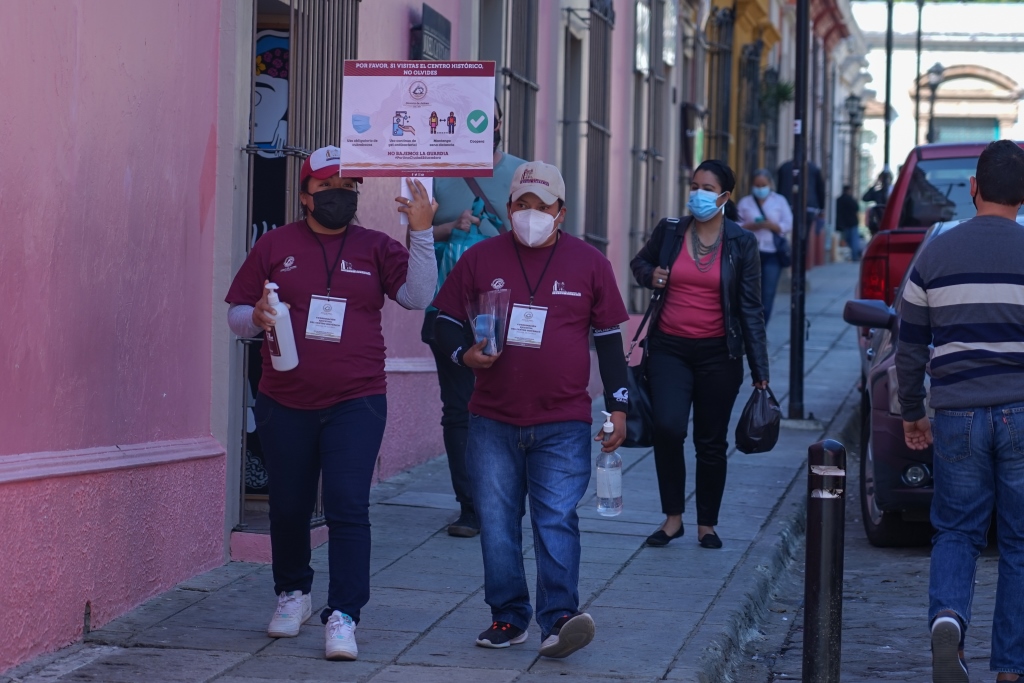 Ante los riesgos de contagio por el virus SARS-COV 2 (Covid-19), el edil capitalino instruyó a la coordinadora Ejecutiva del Centro Histórico, Alicia Bueno Velasco, a instalar cuadrillas que promuevan, en los turistas y en la ciudadanía oaxaqueña, el uso correcto del cubrebocas. Estos grupos de jóvenes estarán trabajando los días jueves, viernes y sábado, por ser los días de mayor afluencia, en un horario de 10:00 a 17:00, recorriendo las calles del Centro Histórico.