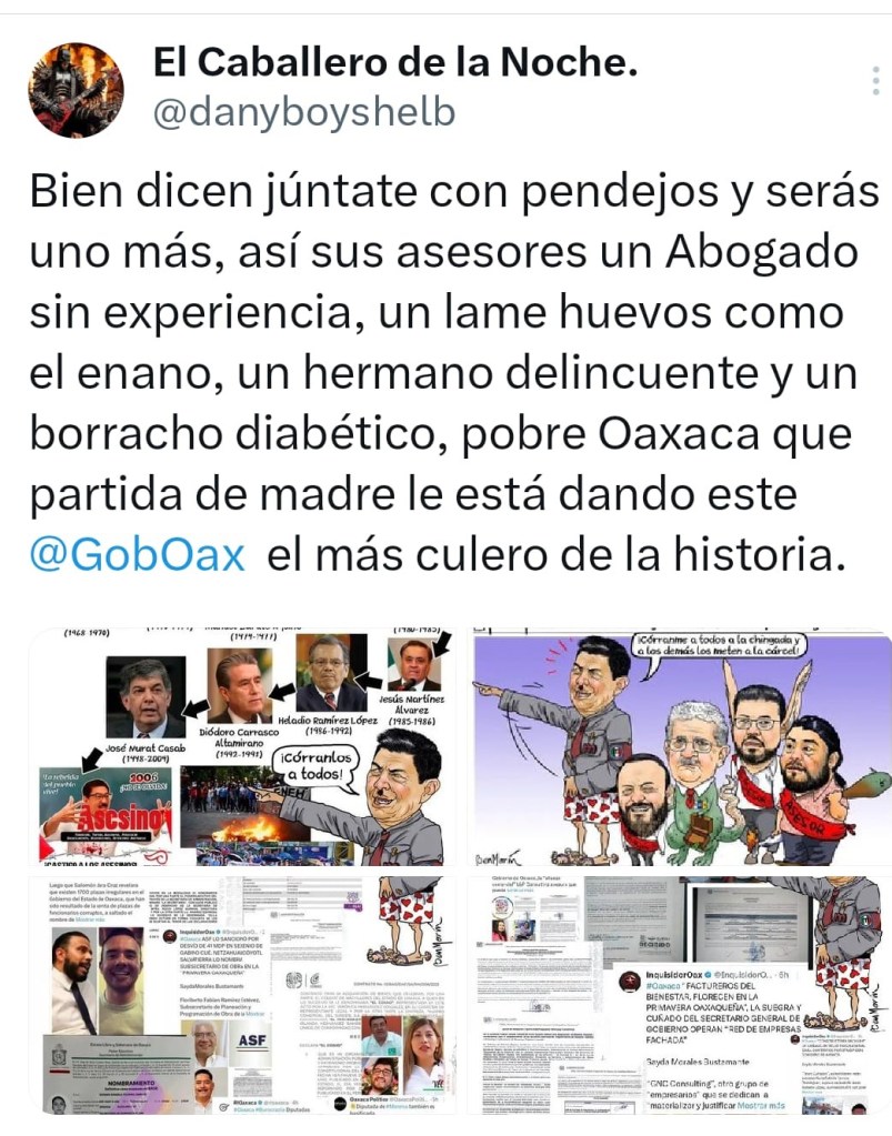 Ante este grave atentado a los derechos laborales y humanos ejercidos contra estos trabajadores, exhortamos a los oaxaqueños a que salgan a las calles para destruir la dictadura comunista del traidor a la Patria, López Obrador; a fin de que Oaxaca se convierta en el Sur, en el más claro ejemplo para qué, ciudadanos de otros estados del país salgan también a las calles para mandar a la chingada a la tiranía comunista de Andrés Manuel López Obrador, e instaurar la República, para que López, Claudia, la espuria, y la secta diabólica de Morena que se sienten dueños absolutos de México sean encarcelados por los desacatos a la orden de los jueces que han declarado inconstitucional la maldita reforma judicial y paguen también por todo el daño que le han hecho a México y a sus instituciones y por el robo descarado y el saqueo de los recursos del pueblo que los ha convertido en la Casta Dorada de Morena.