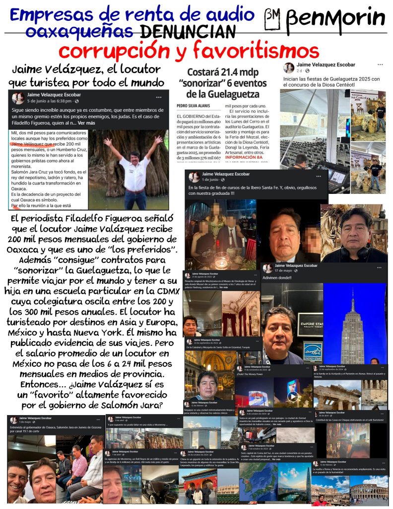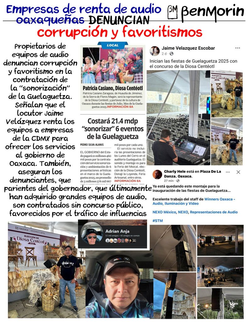 Empero, en Oaxaca existen muchas empresas de renta de audio que cuentan con todo el equipo necesario Y PROPIO para ofrecer servicios de gran calidad. Los empresarios inconformes aseguran que el locutor Jaime Velázquez no cuenta con los equipos de audio necesarios y que, por ello, los renta a una empresa foránea de la CDMX… “¿Cómo podría ganar un concurso para una contratación si no comprueba que cuenta con esos equipos?”, cuestionan los denunciantes.