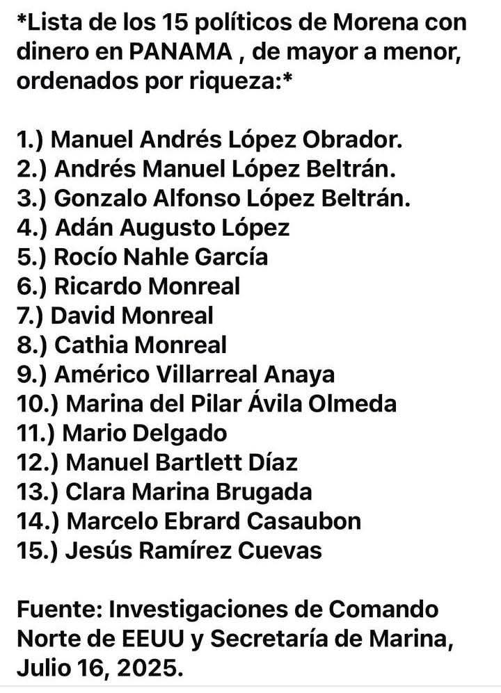 Lista de 15 politicos de Morena con dinero en Panama, de mayor a menor, ordenados por riqueza.