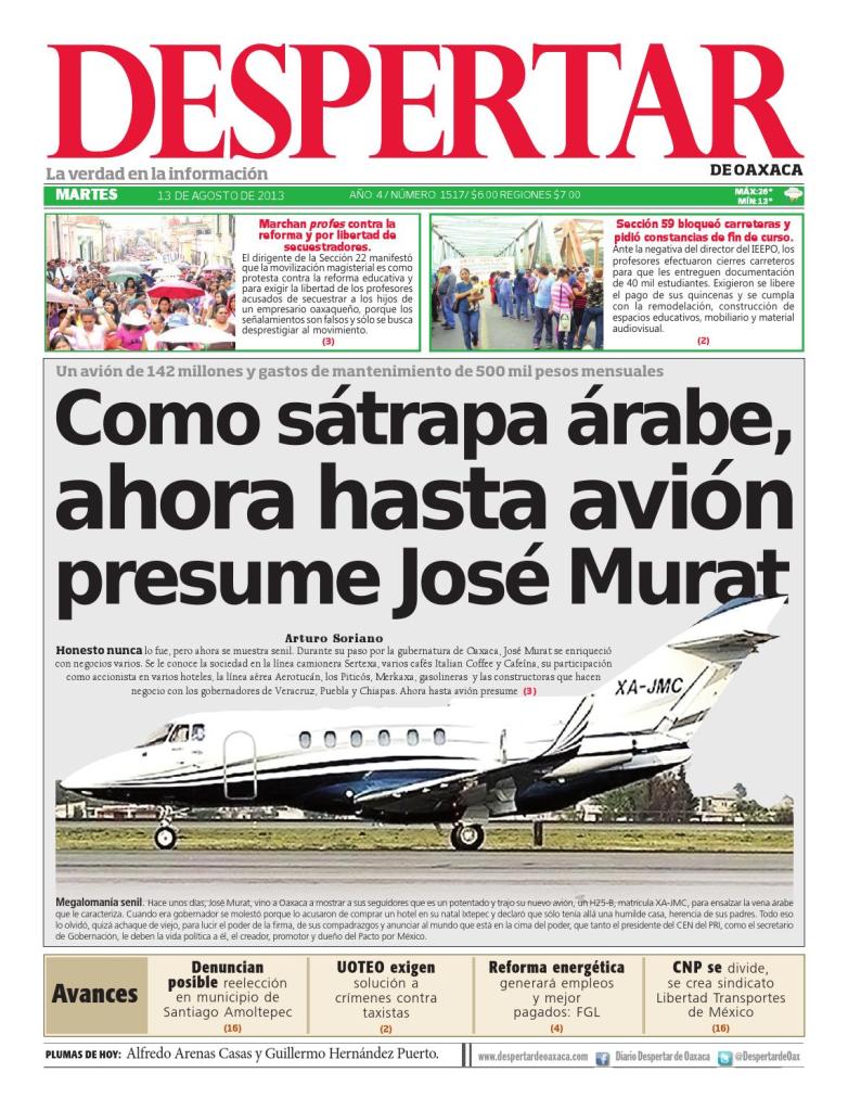 El 13 de agosto del año 2013, el diario Despertar de Oaxaca, publicó en su portada la fotografía del avión en que llegó a Oaxaca José Murat.