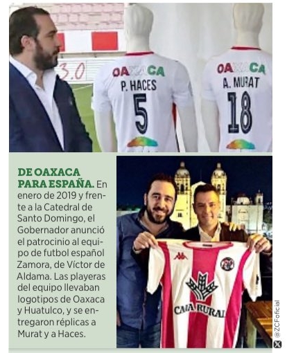 DE OAXACA PARA ESPAÑA. En enero de 2019 y frente a la Catedral de Santo Domingo, el Gobernador anunció el patrocinio al equipo de futbol español Zamora, de Víctor de Aldama. Las playeras del equipo llevaban logotipos de Oaxaca y Huatulco, y se entregaron réplicas a Murat y a Haces.